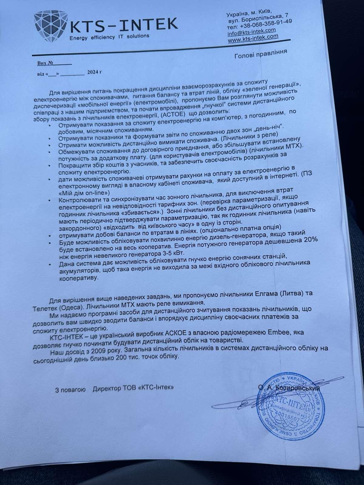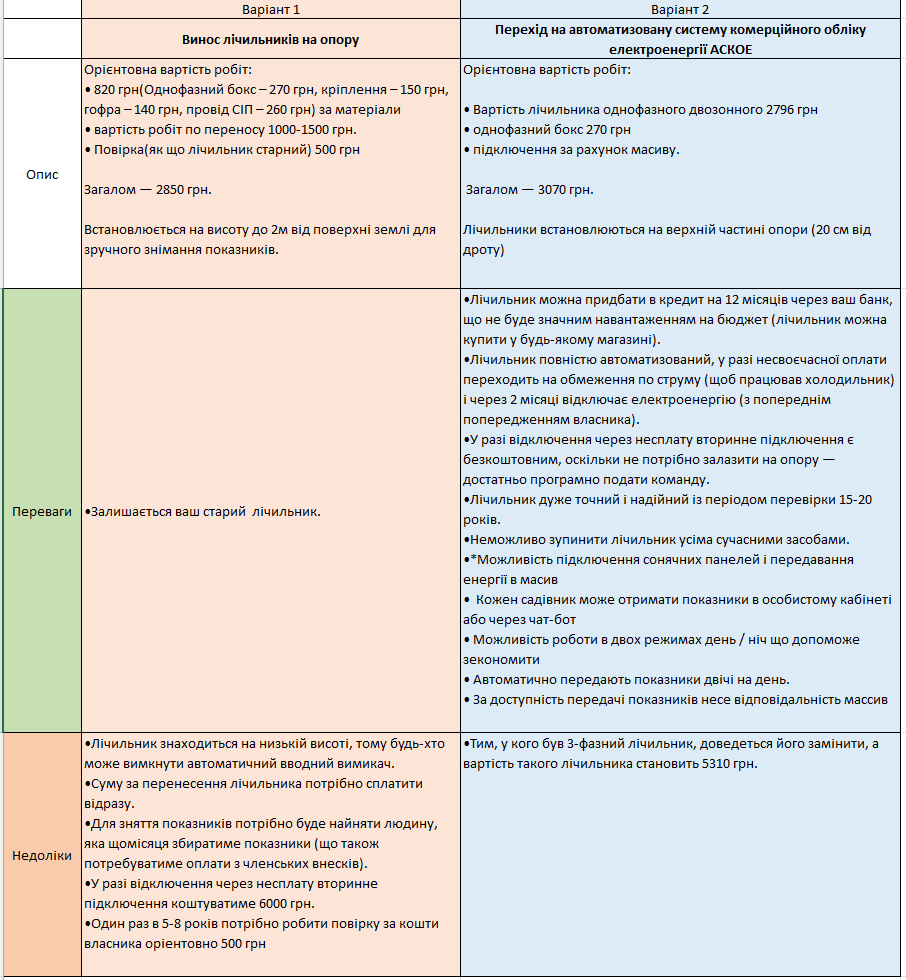 - Перехід на автоматизовану систему комерційного обліку електроенергії АСКОЕ. Лічильники встановлюються на верхній частині опори (20 см від дроту), автоматично передають показники двічі на день. Кожен садівник може отримати показники в особистому кабінеті або через чат-бот. Вартість лічильника 2796 грн, однофазний бокс 270 грн, підключення за рахунок масиву. Загалом — 3070 грн.